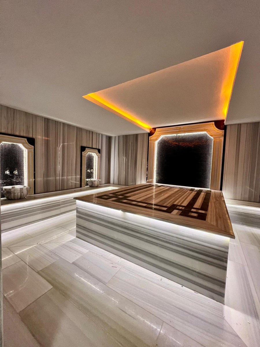 Die Wohnanlage bietet alles, was man von einem modernen Resort erwartet. Entspannen Sie im hauseigenen Hamam, nutzen Sie die Sauna oder halten Sie sich im Fitnesscenter fit. Ein großzügiger Außenpool steht Ihnen ebenfalls zur Verfügung. Die zentrale Lage ermöglicht es Ihnen, Cafés, Supermärkte und Restaurants in wenigen Minuten zu Fuß zu erreichen.