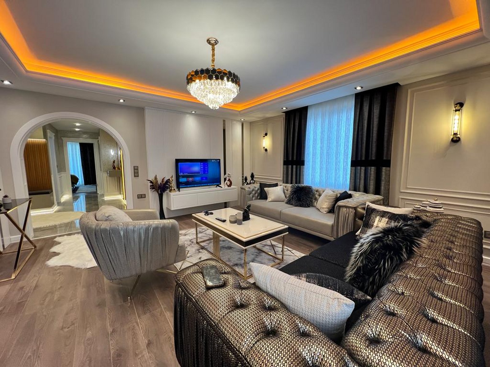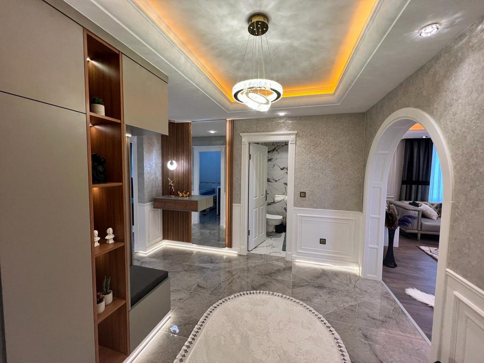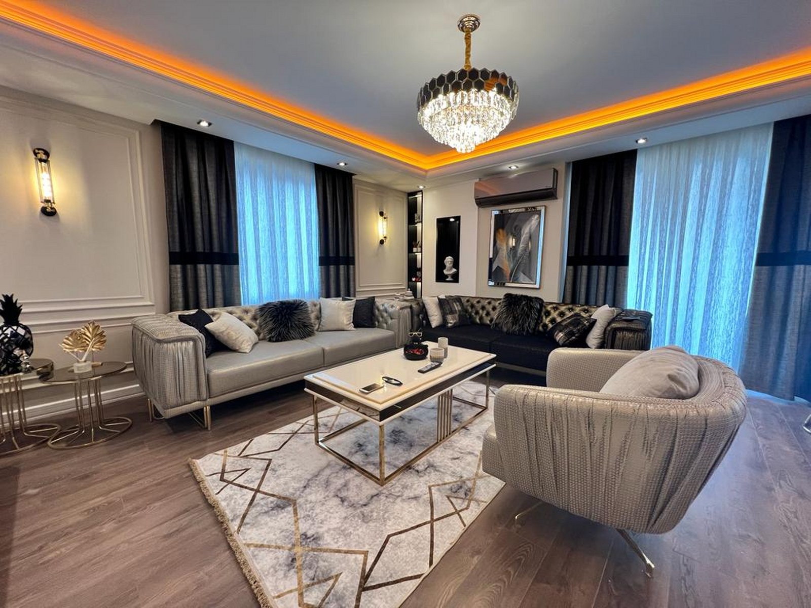 Willkommen in Ihrer neuen Luxuswohnung mit Meerblick in Alanya. Diese großzügige 2+1 Immobilie im 3. Stock definiert Komfort neu. Auf einer Wohnfläche von 134 $m^2$ erwartet Sie ein modernes Wohnerlebnis mit einer erstklassigen, luxuriösen Möblierung, die keine Wünsche offen lässt. Dank der besonderen Ausrichtung nach Süden, Norden und Osten genießen Sie den ganzen Tag über natürliches Licht und eine hervorragende Luftzirkulation.